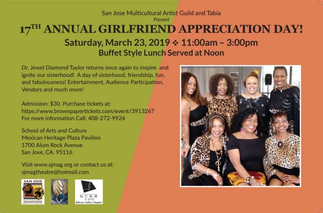 Annual Girlfriend Appreciation Day In partnership with Tabia African-American theatre ensemble, enjoy a day of sisterhood, friendship, fun, and fabulousness! Entertainment, Audience Participation, Vendors Food, and much more! For more information call 408-272-9924.
